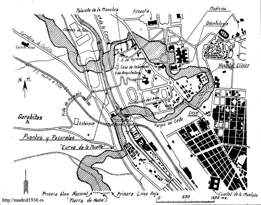 La necesidad de paso hacia los terrenos ganados en la Ciudad Universitaria, por parte del ejército de Franco, requería desde el primer momento en que se toman, 15 de noviembre de 1936, un acceso lo más seguro y protegido posible, para lo cual se tendieron más de veinte pasarelas y puentes, con todas las variables técnicas improvisadas, en una situación de emergencia como es una contienda, lo que obligaba a trabajas de noche, con humedad y sufriendo un incesante acoso artillero y de fusil. Los pontoneros y zapadores, intentaban completar sus trabajos, cada vez más completos, en una sola jornada, con soluciones, como pasarelas deslizantes, protección con sacos terreros, diques de hormigón, paneles metálicos para evitar los disparos, etc., pero las más de las veces eran las avenidas del río Manzanares, especialmente en otoño e invierno, las que se llevaban de cuajo los intentos de comunicación definitiva, sufriendo desde baterías de Puerta de Hierro y desde la zona del Puente de los Franceses, la acción destructora, en que también participaba un tren Blindado. Se intentó incluso tender un pequeño teleférico de una capacidad de 500 kilogramos, que no llegó a estar operativo, por si fallaban las pasarelas.