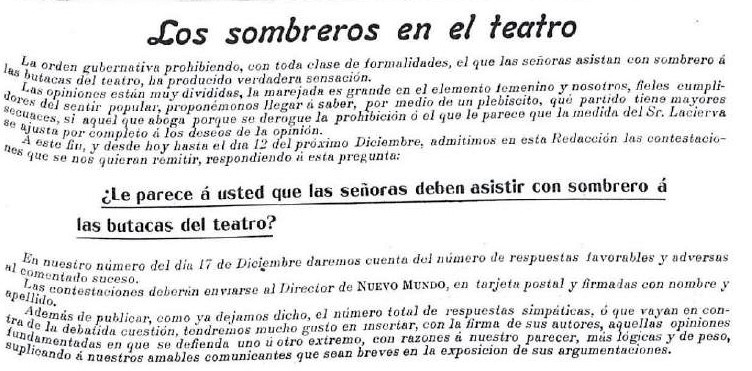 La cosa principió el 21 de noviembre de 1903, cuando al señor Lacierva, que era por entonces el gobernador de Madrid, le dio el naipe de prohibir que las señoras pudieran permanecer con el sombrero puesto en los teatros, en beneficio de los sufridos espeztadores que pudieran sentarse a su retaguardia. Y ejque con aquellos mamometros que se gastaban estas señoras a ver quién era el guapo que guipaba algo. Vamos, que más de uno se iba a su casa in albis.
