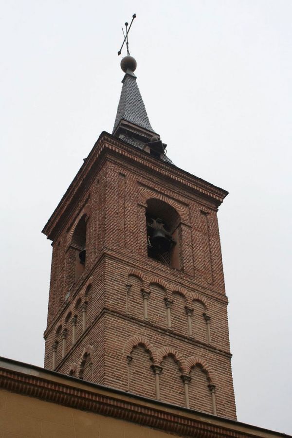 Se ha supuesto que fue minarete o alminar de mezquita musulmana, pero hoy en día parece fuera de toda duda que, aunque fuera edificado por alarifes de progenie musulmana (“mudéjares”) residentes en Madrid, ya lo fue bajo la soberanía de la monarquía castellana. Es una torre cuadrangular, edificada en ladrillo tostado, bajo las premisas en que se edificaban los alminares; es decir, con un machón central alrededor del cual ascendía la escalera hasta el cuerpo de campanas. Su decoración se basa en tres bandas de arquerías ciegas en sus cuatro fachadas. La banda inferior, compuesta de tres arcos trilobulados por cara; la banda intermedia, de tres arcos pentalobulados por cara; y la banda superior de cinco arcos de herradura sencillos por cara, los dos de los extremos más estrechos que los centrales. El actual cuerpo de campanas se corresponde con una reforma efectuada en el siglo XVII, dentro de la remodelación general que se hizo en la totalidad del templo con la construcción de las dos capillas de la epístola, y cuando hacía más de un siglo que el dañado ábside mudéjar había sido sustituido por el actual ábside tardogótico. El interés de esta torre hará que volvamos sobre ella con más detenimiento en otro artículo.