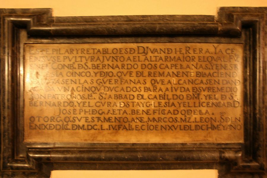 Como detalle curioso, no dejaremos de observar en el muro testero de los pies de la iglesia una inscripción funeraria del siglo XVII, que aloja la sepultura de Juan de Herrera (foto 5). Aunque se ha afirmado tradicionalmente que se corresponde con el primer enterramiento del gran arquitecto cántabro, inmortal por culminar las obras de construcción del Monasterio de San Lorenzo de El Escorial, y en la fachada de la iglesia una moderna placa se empeña en ratificar este aserto, podemos comprobar por la fecha de defunción del ocupante de este enterramiento que no se corresponde con el mismo personaje, ya que el presente falleció en 1654, en tanto que el arquitecto de El Escorial lo hizo en 1597.