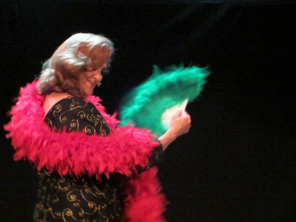 Para el público no hay queja. Se deshace en elogios. Pero los mayores halagos los hace desde las tablas. Interpreta, baila y recita. Es un espectáculo en movimiento. Un torbellino que no para un segundo en noventa minutos. Tienen cabida chotis, boleros, algún pasodoble, La vie en rose (con un envidiable acento arrastrado digno de la banlieu parisina) y por supuesto cuplé. Del llanto a la risa, hay lugar para la emoción en un hermoso dúo con su madre -gracias a una grabación estupenda- que pone la piel de gallina. El monólogo cómico y explicativo se funde con el canto y el piano y con el propio público, cuya intervención es imprescindible. La cercanía es absoluta en el pequeño Teatro Prosperidad. Pocas filas y excelente acústica aseguran una velada casi íntima. Como ya habrá adivinado el lector el monólogo no sale del cráneo privilegiado de ningún ajeno. Ella misma recrea y escribe sus propias anécdotas medio reales y medio inventadas para hacer reír a quien quiera pasar un rato en su compañía. El público más mayor es el más fácil porque conoce de sobra de qué se trata, pero ella es más de retos “yo lo que quiero es llegar a los jóvenes”. Y lo consigue cuando le dan la ocasión. En la RESAD (Real Escuela Superior de Arte Dramático) tuvo un gran éxito y recuerda con orgullo una anécdota que le ocurrió hace no mucho: el nieto de una pareja que no se pierde casi ninguna tarde su actuación se acercó a ella al terminar y desde sus dieciséis años le dijo “yo he venido aquí para hacerle un favor a mi abuelo, pero ha sido mi abuelo el que me lo ha hecho a mí”.