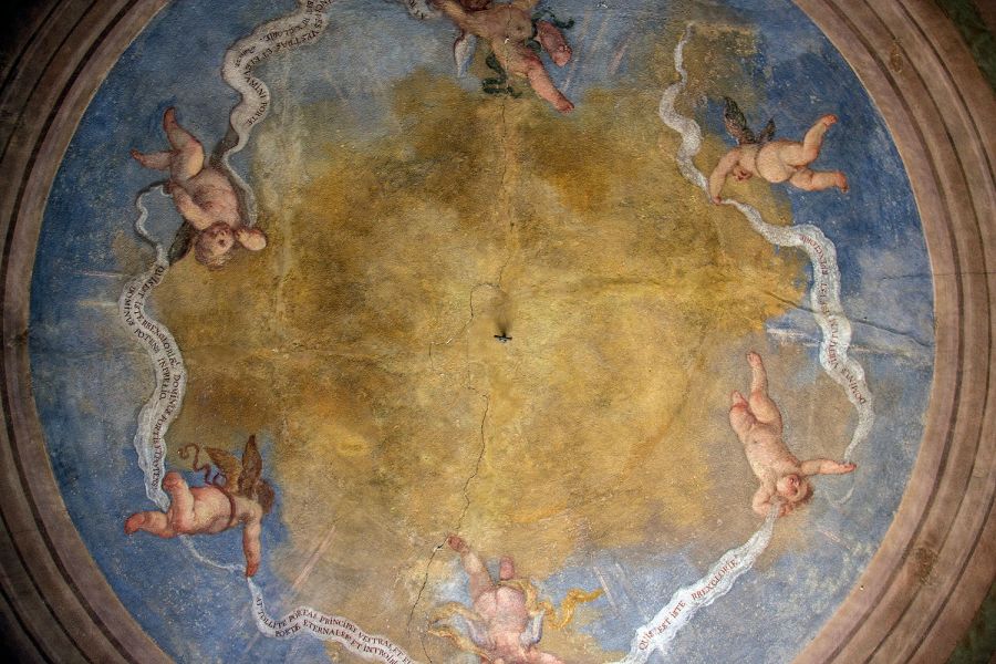 Tras rebasar la lonja, y atravesada la portada central, no deja de sorprendernos el amplio atrio o “nártex” que nos recibe, con basamento y solado graníticos, y cuya bóveda plana nos ofrece una gran tondo circular con un fresco que, a modo de trampantojo, nos ofrece una visión de un cielo azul centrado por un esplendente astro diurno circunvalado por angelitos en llamativos escorzos unidos por una larga filacteria (foto 6) obra de los hermanos Luis (1715-1764) y Alejandro (1719-1772) González Velázquez, afamados pintores del siglo XVIII – el segundo, también arquitecto- que realizan la totalidad de los frescos del templo.