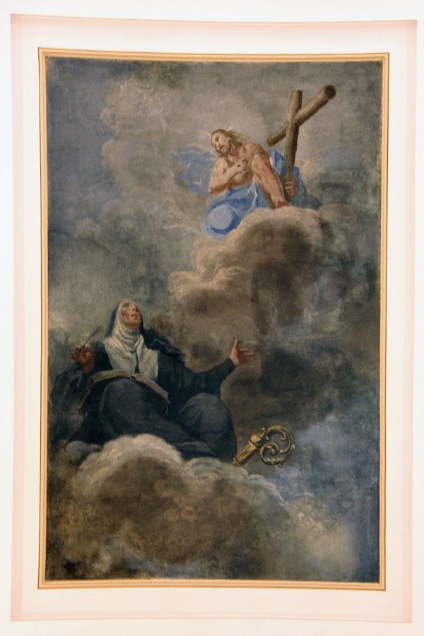 Por último, y antes de salir del templo, alzamos la mirada hacia la bóveda de cañón y poder admirar algunos frescos más de los hermanos González Velázquez. Así, en el tramo más próximo a la puerta contemplamos la representación de Santa Isabel, abadesa benedictina (foto 27), alentada por la Virgen María; a continuación, Santa Catalina de Suecia (foto 28), con hábito blanco cisterciense, adorando la Sagrada Eucaristía; sigue Santa Gertrudis la Magna (foto 29), inspirada por Cristo Resucitado. El último fresco se encuentra en la bóveda del presbiterio y representa a Santa Escolástica (foto 30), abadesa y hermana de San Benito, en Gloria, adorando la Sagrada Eucaristía.