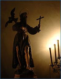 Dejando el presbiterio nos dirigimos al lateral izquierdo del templo (“evangelio”) y en la primera capilla que encontramos podemos contemplar un vistoso retablo de madera dorada y estofada, datado en las postrimerías del siglo XVIII (Fig. 10) pero de fuerte estilo barroco, de un solo cuerpo, entablamento convexo partido, limitado por columnas estriadas de orden corintio, que alberga hornacina con escultura de San José con el Niño de indudable categoría artística, y datado en el siglo XVII, es atribuida a Sebastián Herrera Barnuevo> (1619-1671), en el que destaca el modelado del manto de José; con el brazo izquierdo sustenta al niño, mientras camina apoyándose en su báculo, ornado de lirios como símbolo de castidad.