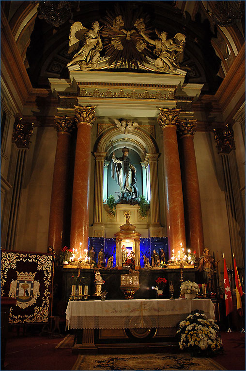 El testero de esta capilla mayor ha sufrido recientemente un grave riesgo de derrumbe. Como consecuencia de la demolición interior del antiguo colegio, conservando tan sólo sus fachadas exteriores, para destinarlo a nueva sede del Colegio Oficial de Arquitectos de Madrid, el templo ha quedado exento por su cabecera. Precisamente, y al no haberse concebido como edificio aislado sino apoyado e integrado en un gran complejo edilicio, que le servía de muro de carga por esa zona, ha tenido que ser urgentemente apuntalado por su exterior. El padre Villar nos explicó que el muro del testero tenía un grosor realmente exiguo y ha existido un riesgo real de derrumbe. Los ángeles que rematan el retablo mayor llegaron a inclinarse ligeramente, amenazando con el riesgo más que evidente de la caída de todo el retablo y su enterramiento entre escombros. Afortunadamente, se pudo intervenir y subsanar esta deficiencia sobrevenida por el discurrir de las obras justo a tiempo.