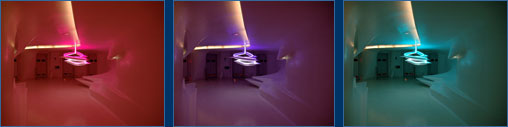 Las paredes son unos paneles con lucecitas de colores que se muestran cambiantes según el movimiento del huésped. El diseño parece futurista e invita al visitante a pensar en una sala de control más propio de una película de ciencia ficción.