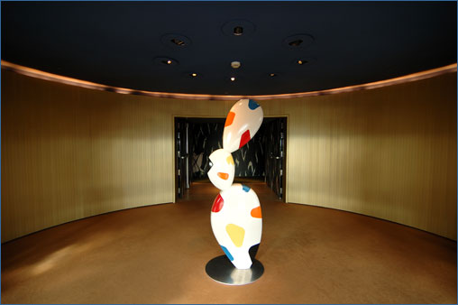 Nada más salir del ascensor, nos encontramos con una escultura obra de Chillida que parece hecha en metal líquido, simulando al cromo. Chillida, amigo personal de Norman Foster, aporta parte de su espíritu al trabajo desarrollado por el arquitecto.