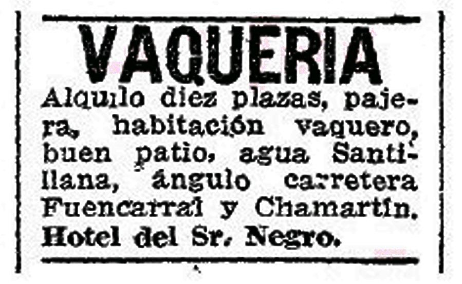 ¿Sería posible que la denominación de Hotel del Negro viniese por el apellido del político citado? Si nos atenemos a un anuncio de una vaquería, reproducido bajo estas líneas, diríamos que sí, ya que el punto en el que ubica el llamado aquí "Hotel del Sr. Negro", lo que confirma la opción del apellido, es inequívoca.